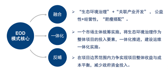 生態(tài)價值化EOD模式是“綠水青山就是金山銀山”理念在項目運(yùn)作中的應(yīng)用,可推動生態(tài)環(huán)境治理與關(guān)聯(lián)產(chǎn)業(yè)融合,實現(xiàn)生態(tài)價值轉(zhuǎn)化,提升生態(tài)環(huán)境治理項目造血功能,降低政府投資。