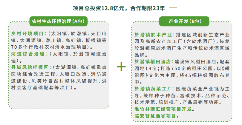 該項(xiàng)目范圍為臨安區(qū)錢塘江流域、苕溪流域面源污染治理和產(chǎn)業(yè)開發(fā),包括144個(gè)行政村農(nóng)村生活污水治理及“污水零直排區(qū)”提質(zhì)增效,及河道水生態(tài)環(huán)境綜合整治項(xiàng)目,包括河道水質(zhì)提升改善、截污納 管、水生態(tài)和水環(huán)境綜合治理、對(duì)河道的受污染水體進(jìn)行污染物消減和生態(tài)自凈功能恢復(fù),去除水體中的COD、氨磷等污染物,村落風(fēng)貌景觀樣板區(qū)打造,於潛酒廠,鄉(xiāng)村稻田文旅配套設(shè)施,蔬菜工廠,毛竹林 經(jīng)營(yíng)碳匯等。