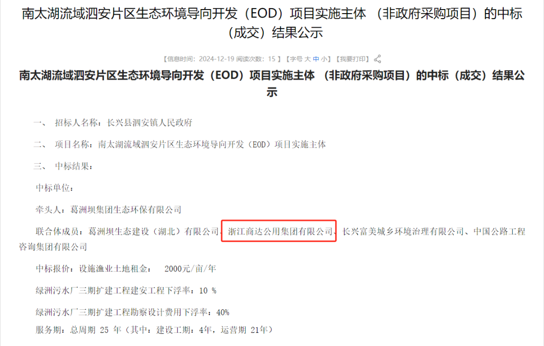 近日,商達(dá)公用集團(tuán)作為聯(lián)合體成員中標(biāo)南太湖流域泗安片區(qū)生態(tài)環(huán)境導(dǎo)向開發(fā)(EOD)項(xiàng)目,項(xiàng)目總投資29.7億元。