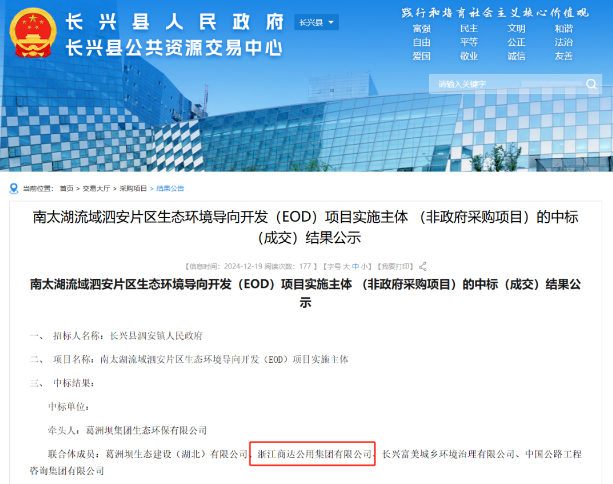 商達公用集團中標長興南太湖流域泗安片區(qū)生態(tài)環(huán)境導(dǎo)向開發(fā)(EOD)項目