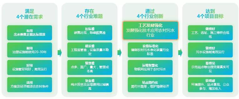 農(nóng)村污水治理4.0是一個系統(tǒng),其內(nèi)涵概況起來,主要包含了4個“4”,分別為滿足4個潛在需求、存在4個行業(yè)難題、通過4個行業(yè)創(chuàng)新、達(dá)到4個項目目標(biāo),最終要達(dá)到的是提升村民獲得感,也是農(nóng)村人居環(huán)境建設(shè)的出發(fā)點和落腳點。