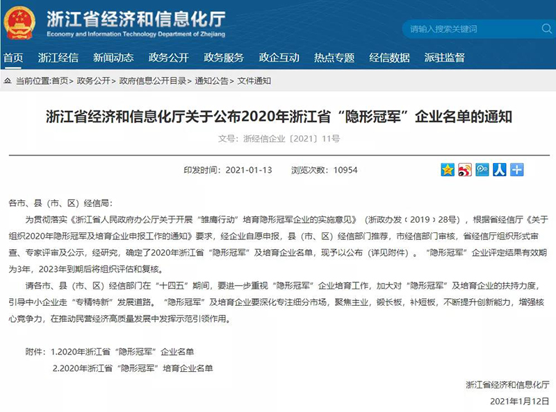 浙江省“隱形冠軍”企業(yè)是由浙江省人民政府辦公廳組織開展的一項(xiàng)評選活動,從產(chǎn)品市場占有率、產(chǎn)品創(chuàng)新性、生產(chǎn)技術(shù)水平、企業(yè)持續(xù)創(chuàng)新能力等方面打分,對企業(yè)有著嚴(yán)格要求。主要產(chǎn)品在行業(yè)內(nèi)具有優(yōu)良信譽(yù),且市場占有率位于全國前5位或全省前3位;企業(yè)研發(fā)經(jīng)費(fèi)支出占營業(yè)收入的比重不低于3%;相關(guān)關(guān)鍵性能指標(biāo)處于國際同類產(chǎn)品的領(lǐng)先水平。