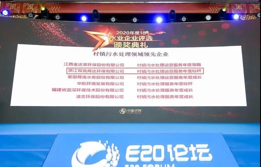 雙良商達(dá)榮獲“2020年度水業(yè)細(xì)分領(lǐng)域領(lǐng)跑及單項(xiàng)能力領(lǐng)跑企業(yè)——村鎮(zhèn)污水處理運(yùn)營(yíng)服務(wù)年度標(biāo)桿”獎(jiǎng)。