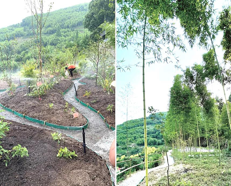 在指南村的入口處,有一個(gè)占地1500平方的中藥種植示范基地百草園,里面有150多種中草藥,主要以科研示范為主。一方面起到了固碳的作用,另外一方面,為指南村的鄉(xiāng)村旅游增加了一道獨(dú)有的風(fēng)景。