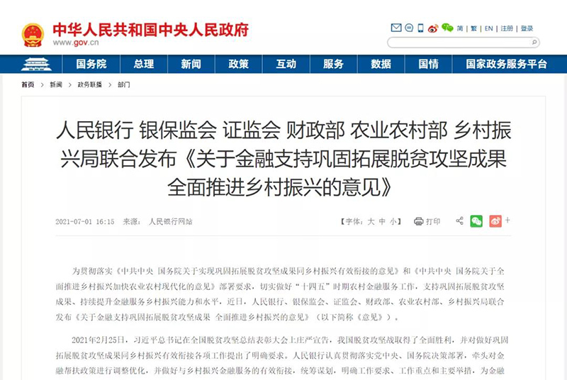 中國人民銀行等六部門聯(lián)合發(fā)布了《關(guān)于金融支持鞏固拓展脫貧攻堅(jiān)成果 全面推進(jìn)鄉(xiāng)村振興的意見》