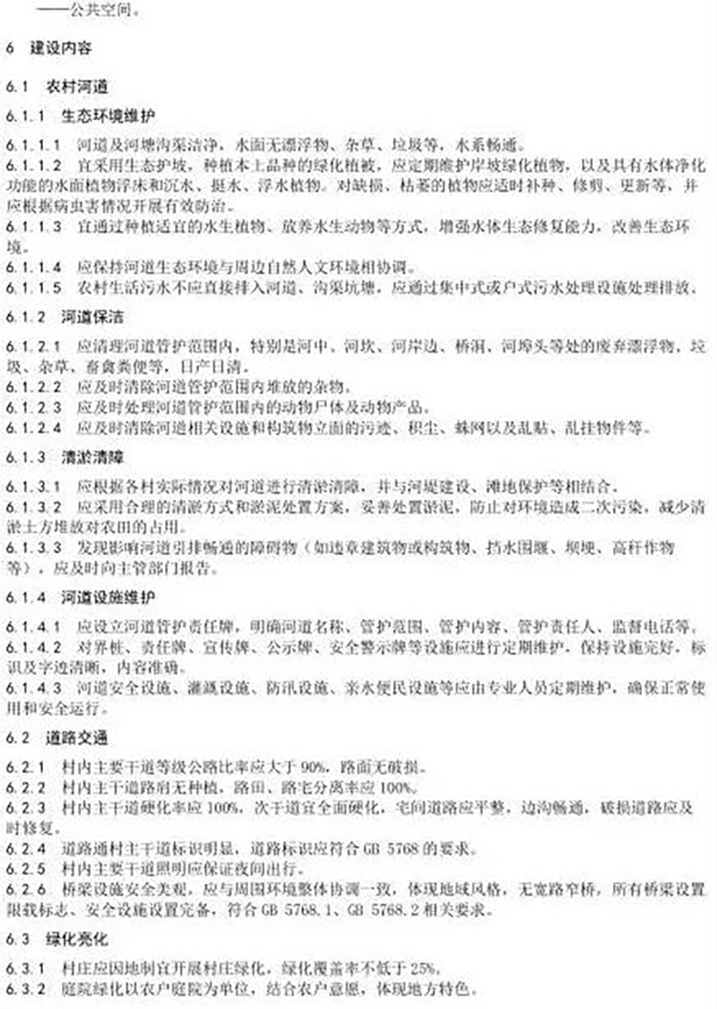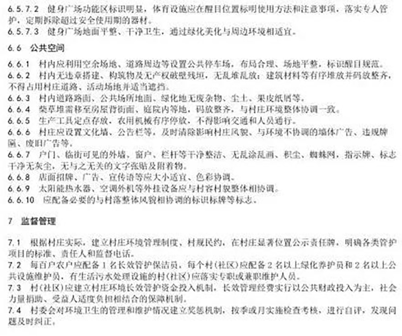 細(xì)化建設(shè)標(biāo)準(zhǔn)。圍繞農(nóng)村人居環(huán)境建設(shè)中包含的農(nóng)村河道、道路交通、綠化亮化、環(huán)境保潔、公共設(shè)施、公共空間等六項重點管護內(nèi)容,逐一細(xì)化標(biāo)準(zhǔn),反復(fù)征求意見,使管護內(nèi)容有標(biāo)準(zhǔn)、可操作、能量化。農(nóng)村河道管護涵蓋生態(tài)環(huán)境維護、河道保潔、清淤清障、河道設(shè)施維護等內(nèi)容;道路交通管護涵蓋主次干道、橋梁設(shè)施、路道修復(fù)、安全設(shè)施等內(nèi)容;綠化亮化管護涵蓋庭院綠、路渠綠化、農(nóng)田林網(wǎng)建設(shè)、公共照明等內(nèi)容;環(huán)境保潔管護涵蓋畜禽養(yǎng)殖、生活垃圾、建筑垃圾、戶廁衛(wèi)生、糞污處理等內(nèi)容,公共設(shè)施管護涵蓋供水飲水、生活用能、信息建設(shè)、公共廁所、農(nóng)村綜合服務(wù)中心、農(nóng)村健身廣場等內(nèi)容;公共空間管護涵蓋公共停車場、文化墻、公告欄、村容村貌、招牌廣告等內(nèi)容。