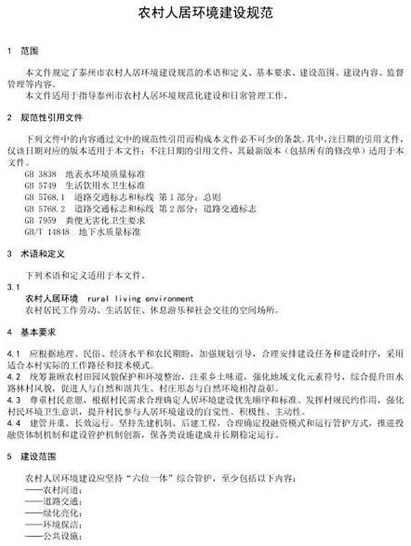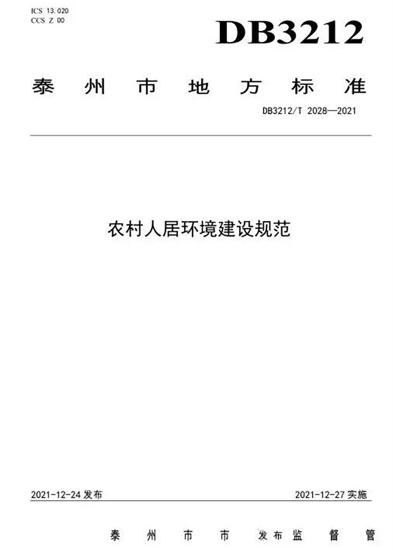 近日,江蘇省泰州市市場監(jiān)督管理局發(fā)布泰州市地方標(biāo)準(zhǔn)《農(nóng)村人居環(huán)境建設(shè)規(guī)范》(DB3212/T2028-2021),該規(guī)范由泰州市農(nóng)業(yè)農(nóng)村局、泰州市標(biāo)準(zhǔn)化院、泰州醫(yī)藥高新區(qū)(高港區(qū))農(nóng)業(yè)農(nóng)村局共同起草,是江蘇省第一個農(nóng)村人居環(huán)境建設(shè)方面的地方性標(biāo)準(zhǔn),有利于指導(dǎo)農(nóng)村人居環(huán)境規(guī)范化建設(shè)和日常管理工作。