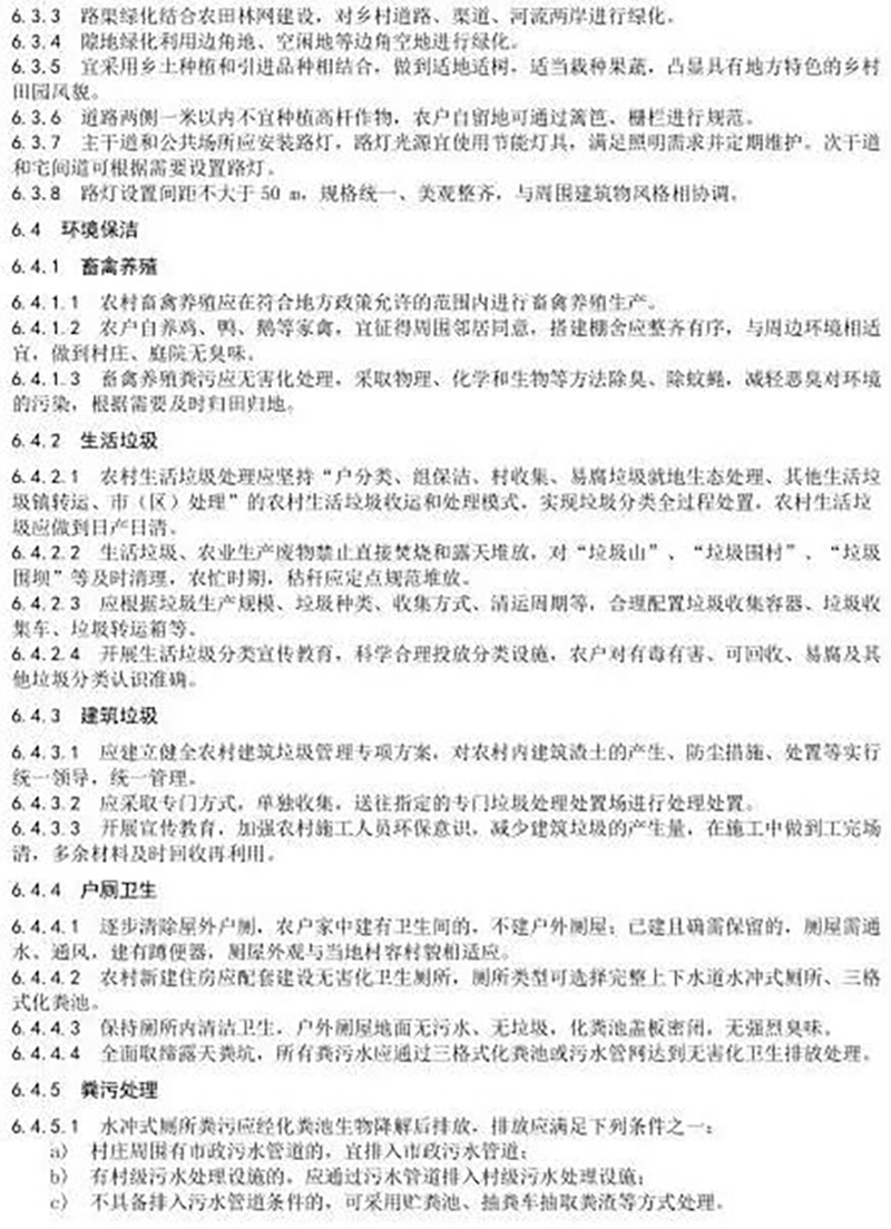 明確建設(shè)要求。《農(nóng)村人居環(huán)境建設(shè)規(guī)范》提出,推進農(nóng)村人居環(huán)境建設(shè),要堅持四項基本要求。一要加強規(guī)劃引導(dǎo)。根據(jù)地理、民俗、經(jīng)濟水平和農(nóng)民期盼,合理安排建設(shè)任務(wù)和建設(shè)時序。二要注重鄉(xiāng)土味道。統(tǒng)籌兼顧農(nóng)村田園風(fēng)貌保護和環(huán)境整治,強化地域文化元素,綜合提升田水路林村風(fēng)貌,促進人與自然和諧共生、村莊形態(tài)與自然環(huán)境相得益彰。三要尊重村民意愿。根據(jù)村民需求合理確定人居環(huán)境建設(shè)優(yōu)先順序和標(biāo)準(zhǔn),發(fā)揮村規(guī)民約作用,提升村民參與人居環(huán)境建設(shè)的自覺性、積極性、主動性。四是堅持建管并重。先建機制、后建工程,合理確定投融資模式和運行管護方式,推進投融資體制機制和建設(shè)管護機制創(chuàng)新,保各類設(shè)施建成并長期穩(wěn)定運行。
