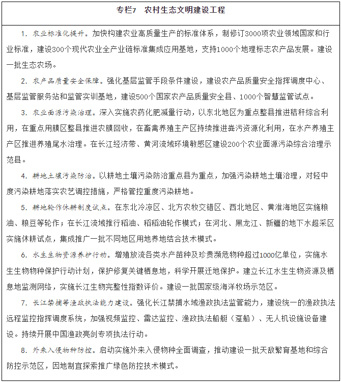 推進(jìn)重點(diǎn)區(qū)域生態(tài)環(huán)境保護(hù)。全面實(shí)施長江流域重點(diǎn)水域十年禁漁,推進(jìn)以長江為重點(diǎn)的漁政執(zhí)法能力建設(shè),做好退捕漁民安置保障工作。推進(jìn)長江水生生物資源和水域生態(tài)保護(hù)修復(fù),實(shí)施中華鱘、長江江豚、長江鱘拯救行動計劃。開展長江、黃河流域農(nóng)業(yè)面源污染治理,實(shí)施深度節(jié)水控水行動。建立生態(tài)產(chǎn)品價值實(shí)現(xiàn)機(jī)制,在長江流域等開展試點(diǎn)。