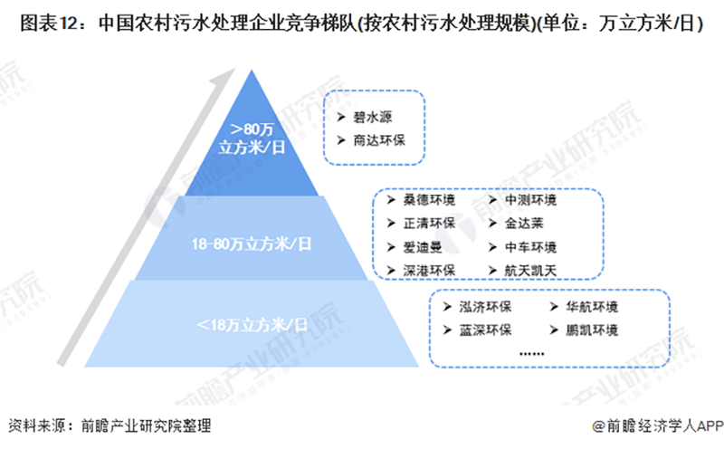 根據(jù)企業(yè)的農(nóng)村污水處理總規(guī)模劃分,可分為三個(gè)梯隊(duì),第一梯度為農(nóng)村污水處理總規(guī)模在80萬(wàn)立方米/日以上的企業(yè),有碧水源、商達(dá)環(huán)保。第二梯隊(duì)為農(nóng)村污水處理總規(guī)模在18-80萬(wàn)立方米/日以上的企業(yè),包括桑德環(huán)境、正清環(huán)保、愛(ài)迪曼、金達(dá)萊、深港環(huán)保、中車環(huán)境、中測(cè)環(huán)境和航天凱天。第三梯隊(duì)為農(nóng)村污水處理總規(guī)模在小于18萬(wàn)立方米/日的企業(yè),代表性企業(yè)有泓濟(jì)環(huán)保、華航環(huán)境、藍(lán)神環(huán)保、鵬凱環(huán)境等。