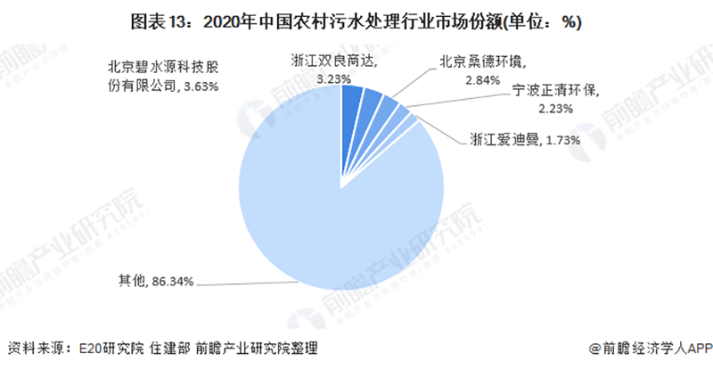 從農(nóng)村污水處理市場(chǎng)份額上看,北京碧水源科技股份有限公司村鎮(zhèn)污水處理項(xiàng)目總規(guī)模全國(guó)排名第一,市占率約為3.63%;其次是浙江雙良商達(dá)環(huán)保有限公司、北京桑德環(huán)境工程有限公司、寧波正清環(huán)保工程有限公司和浙江愛(ài)迪曼環(huán)??萍脊煞萦邢薰?,市占率分別為3.23%、2.84%、2.23%和1.73%。
