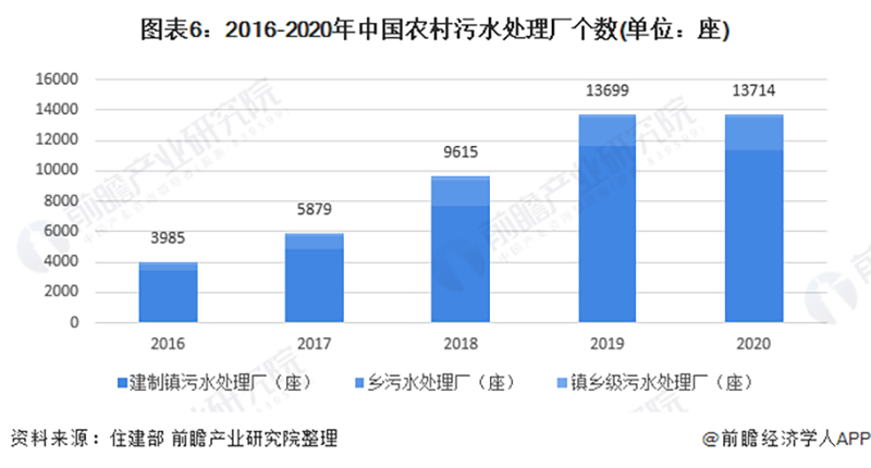 近年來(lái),得益于“十三五”規(guī)劃對(duì)我國(guó)生態(tài)環(huán)境保護(hù)和水污染治理的政策支持,以及財(cái)政部在資金投入上的持續(xù)加碼,我國(guó)農(nóng)村污水處理產(chǎn)業(yè)資源快速增長(zhǎng),截至2020年,我國(guó)有記錄的建制鎮(zhèn)、鄉(xiāng)及鎮(zhèn)鄉(xiāng)特殊區(qū)域累計(jì)擁有污水處理廠13714個(gè),污水處理廠污水處理能力達(dá)2877萬(wàn)立方米/日。
