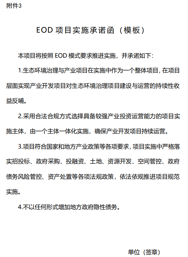 (四)EOD項目應(yīng)一并提交EOD項目實施方案(編制大綱見附件2)與承諾函(模板見附件3)。承諾函由項目申報主體和實施主體(市級及以下人民政府或園區(qū)管委會)蓋章。