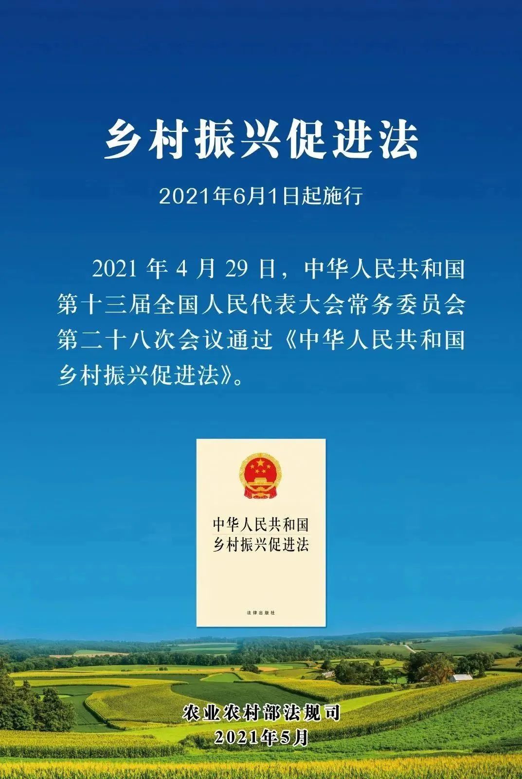 《中華人民共和國(guó)鄉(xiāng)村振興促進(jìn)法》(簡(jiǎn)稱《鄉(xiāng)村振興促進(jìn)法》)于2021年4月29日在第十三屆全國(guó)人民代表大會(huì)常務(wù)委員會(huì)第二十八次會(huì)議上正式審?fù)ㄟ^,并從2021年6月1日起正式施行。