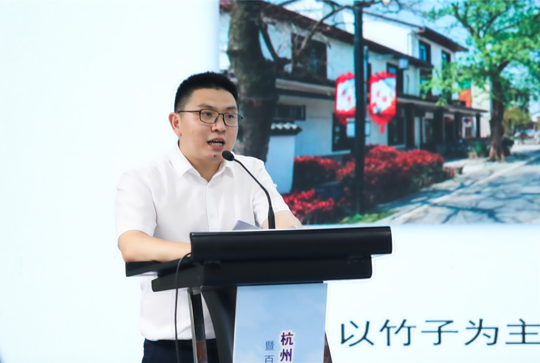 余杭區(qū)林水局領導,浙江農(nóng)林大學環(huán)境研究院所所長鄭展望為百丈竹林經(jīng)營碳匯項目揭牌