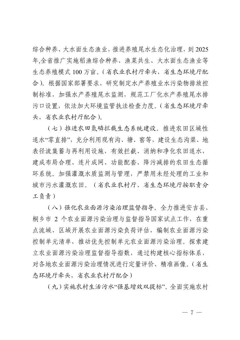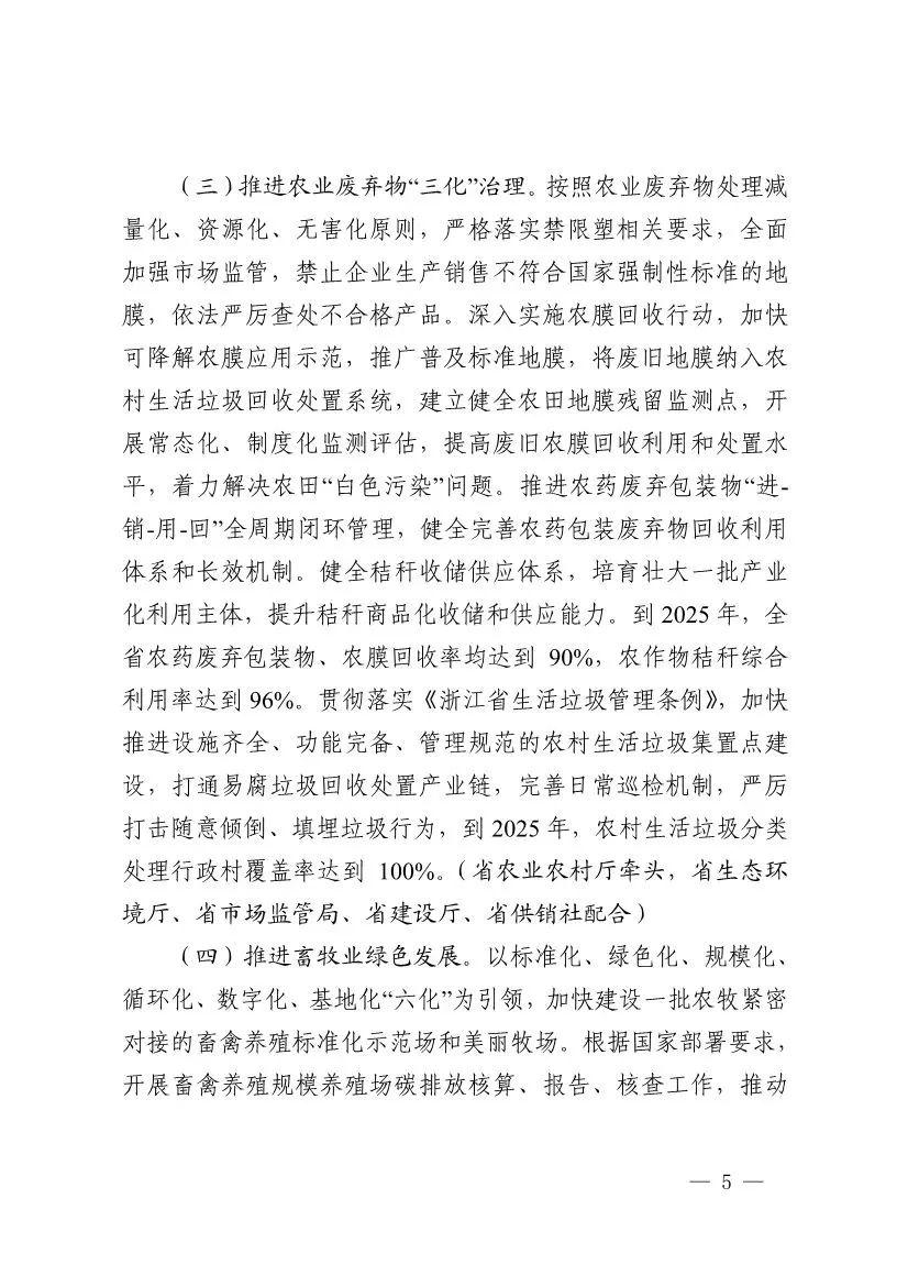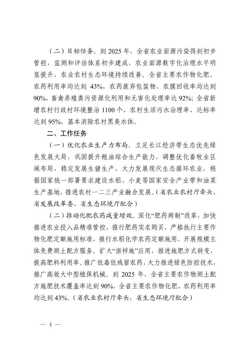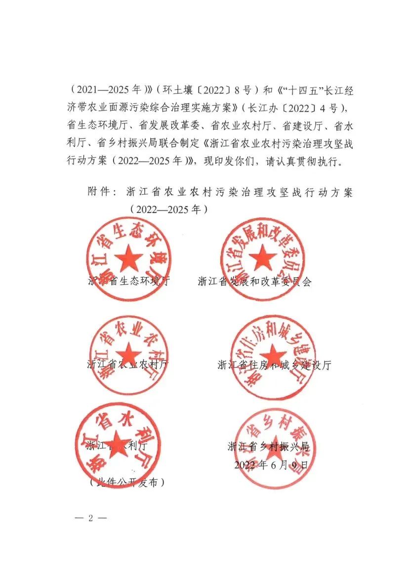 2022年6月9日,浙江省生態(tài)環(huán)境廳、浙江省發(fā)展改革委、浙江省農(nóng)業(yè)農(nóng)村廳等六部門聯(lián)合印發(fā)《浙江省農(nóng)業(yè)農(nóng)村污染治理攻堅戰(zhàn)行動方案(2022—2025年)》,要求到2025年,全省農(nóng)業(yè)面源污染得到初步管控,主要農(nóng)作物化肥、農(nóng)藥利用率均達(dá)到43%,農(nóng)藥廢棄包裝物、農(nóng)膜回收率均達(dá)到90%,畜禽養(yǎng)殖糞污資源化利用和無害化處理率達(dá)92%;全省新增農(nóng)村行政村環(huán)境整治1100個,農(nóng)村生活污水治理率、達(dá)標(biāo)率達(dá)到95%,基本消除農(nóng)村黑臭水體。