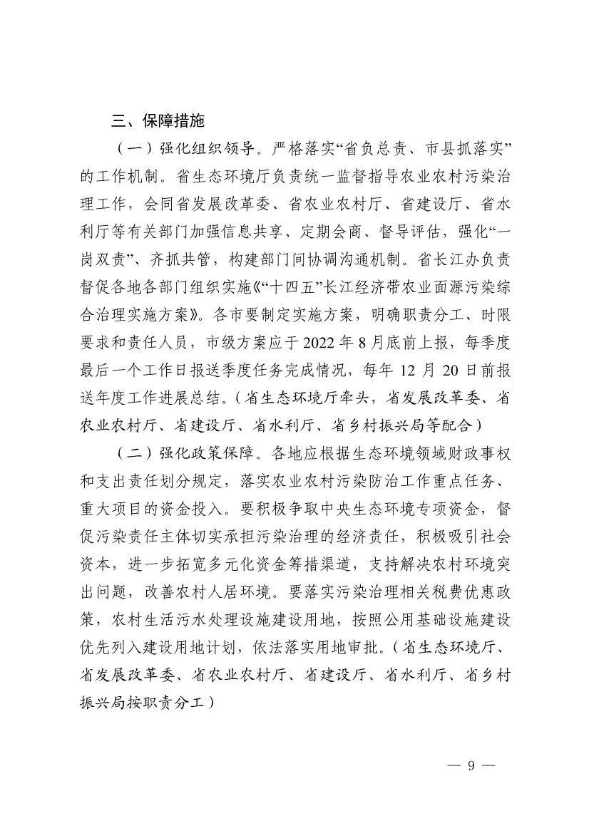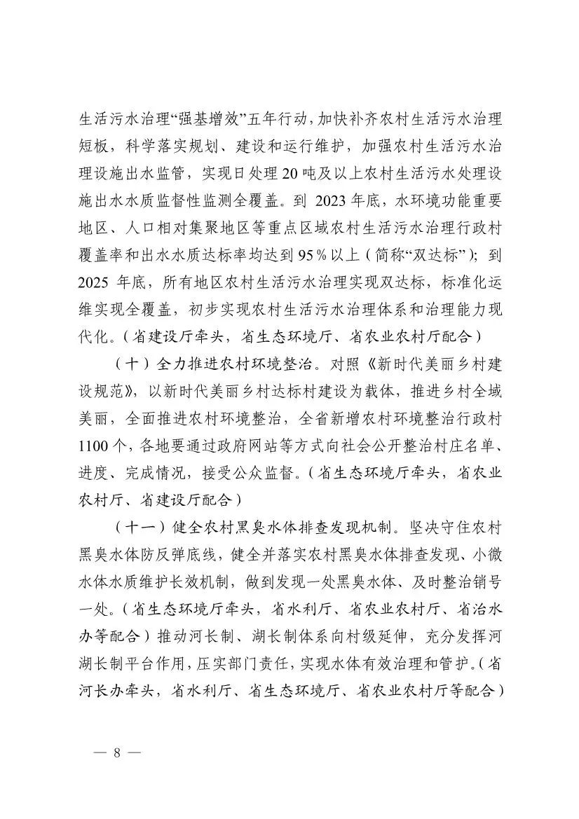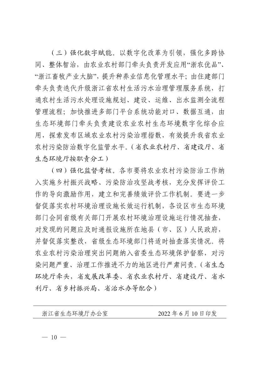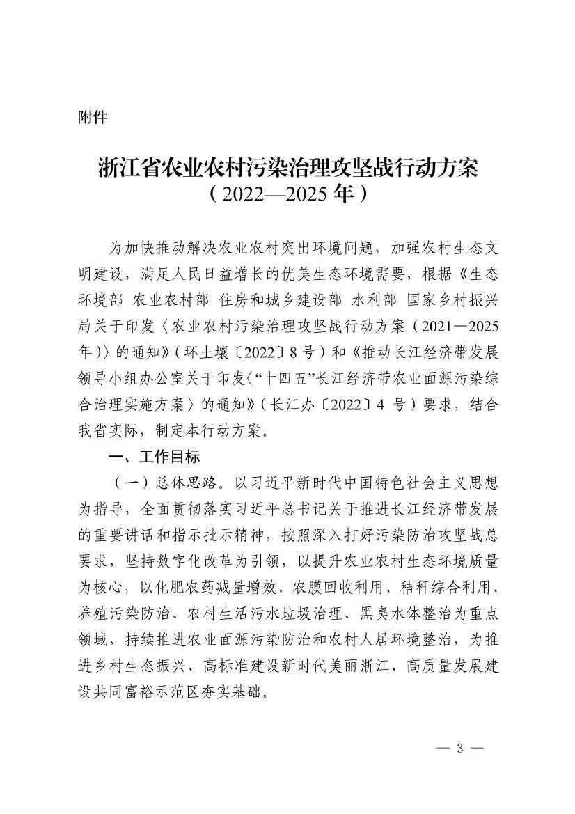2022年6月9日,浙江省生態(tài)環(huán)境廳、浙江省發(fā)展改革委、浙江省農(nóng)業(yè)農(nóng)村廳等六部門聯(lián)合印發(fā)《浙江省農(nóng)業(yè)農(nóng)村污染治理攻堅戰(zhàn)行動方案(2022—2025年)》,要求到2025年,全省農(nóng)業(yè)面源污染得到初步管控,主要農(nóng)作物化肥、農(nóng)藥利用率均達(dá)到43%,農(nóng)藥廢棄包裝物、農(nóng)膜回收率均達(dá)到90%,畜禽養(yǎng)殖糞污資源化利用和無害化處理率達(dá)92%;全省新增農(nóng)村行政村環(huán)境整治1100個,農(nóng)村生活污水治理率、達(dá)標(biāo)率達(dá)到95%,基本消除農(nóng)村黑臭水體。