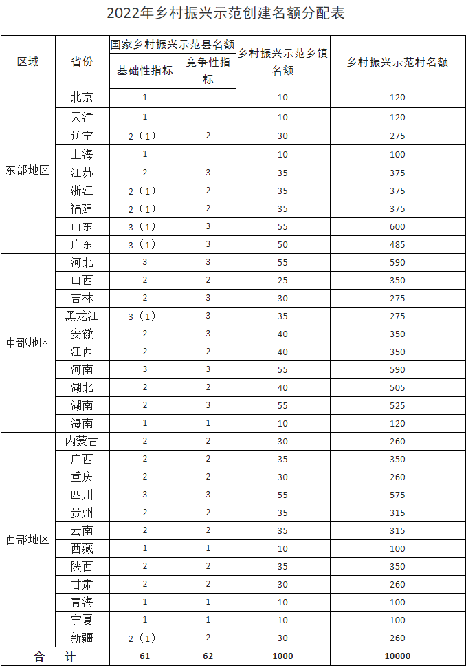 2022年,立足縣、鄉(xiāng)、村資源稟賦和發(fā)展基礎(chǔ),體現(xiàn)東、中、西部區(qū)域特色,農(nóng)業(yè)農(nóng)村部、國家鄉(xiāng)村振興局組織創(chuàng)建100個左右國家鄉(xiāng)村振興示范縣,省級農(nóng)業(yè)農(nóng)村部門、鄉(xiāng)村振興局組織創(chuàng)建1000個左右鄉(xiāng)村振興示范鄉(xiāng)鎮(zhèn)、10000個左右鄉(xiāng)村振興示范村,分層級推進示范創(chuàng)建。力爭用5年左右時間,開展創(chuàng)建工作的國家鄉(xiāng)村振興示范縣基本覆蓋全國各市(地、州、盟)。各地要結(jié)合年度重點工作部署,扎實推進示范創(chuàng)建工作。