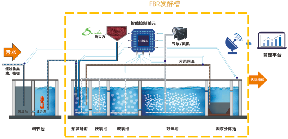 FBR發(fā)酵槽是EEM菌技術(shù)應(yīng)用的核心設(shè)備。一直以來,針對(duì)農(nóng)村污水的處理技術(shù)缺乏對(duì)處理系統(tǒng)核心的認(rèn)識(shí),各種生物處理工藝對(duì)起主導(dǎo)功能作用的微生物認(rèn)識(shí)不足,應(yīng)用方式仍處于比較低端的自然發(fā)生狀態(tài)(如控制溶氧、回流、外加碳源等),特別是當(dāng)前一些商業(yè)化菌劑或菌液產(chǎn)品普遍采用直接投加,但這種簡單接入方式容易導(dǎo)致功能微生物快速流失、周期短、抗沖擊能力差且應(yīng)用成本較高,極大限制了微生物處理效率,難以實(shí)現(xiàn)農(nóng)村污水的低成本處理模式。因此為了解決這一難點(diǎn),商達(dá)技術(shù)性創(chuàng)新首次在農(nóng)村污水處理領(lǐng)域引入了微生物現(xiàn)代發(fā)酵過程技術(shù)理念,開發(fā)了以FAAO預(yù)發(fā)酵工藝技術(shù)為核心的EEM菌技術(shù)專用FBR發(fā)酵槽,EEM菌快速形成優(yōu)勢(shì)菌群,持續(xù)維持EEM菌的高活性、高豐度,顯著增強(qiáng)污水處理系統(tǒng)的生態(tài)穩(wěn)定性和抗沖擊性,為實(shí)現(xiàn)農(nóng)村污水低成本處理邁出了關(guān)鍵一步。