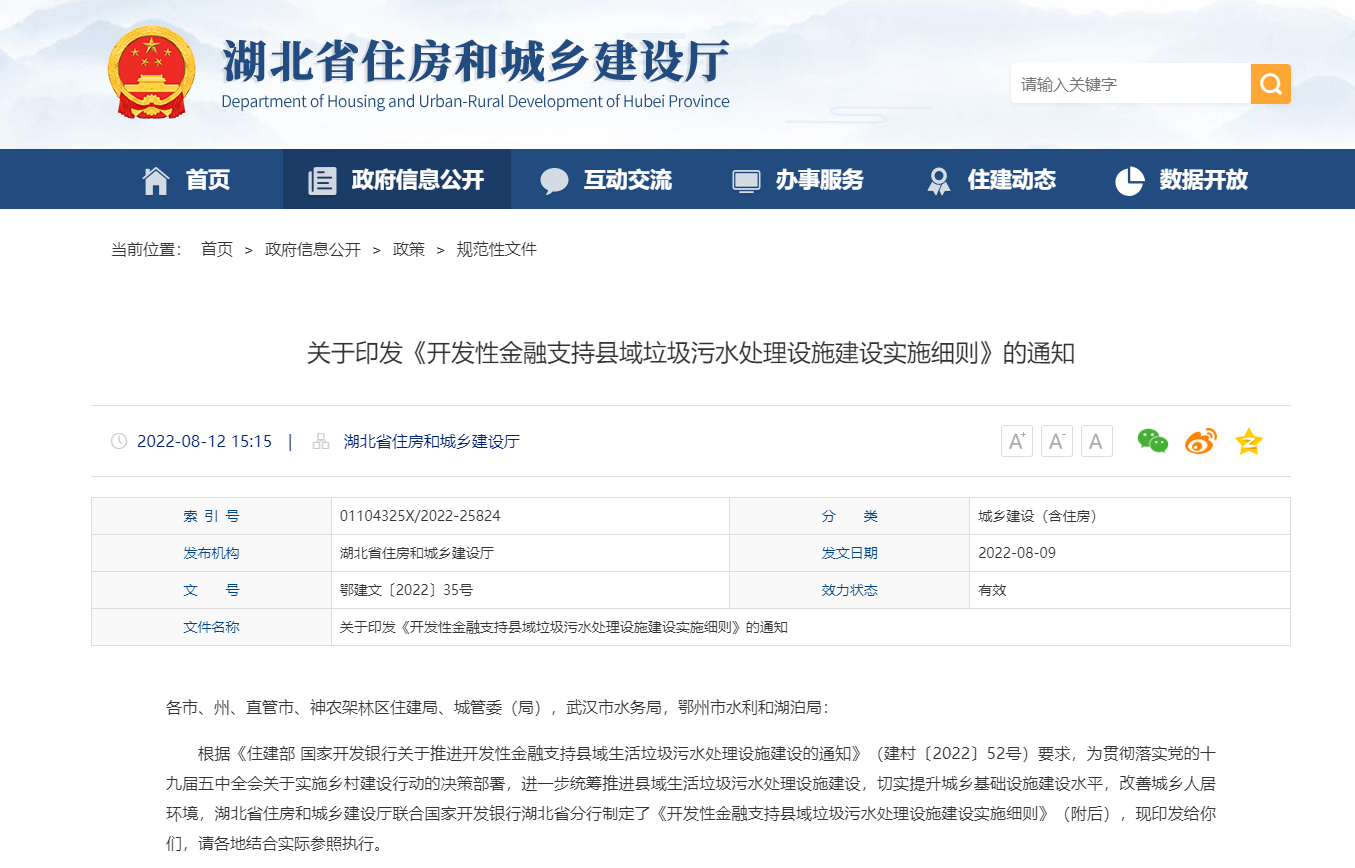 近日,湖北省住建廳發(fā)布關(guān)于印發(fā)《開發(fā)性金融支持縣域垃圾污水處理設(shè)施建設(shè)實施細則》的通知,力爭完成“十四五”期間湖北省縣域垃圾污水處理設(shè)施高標準全覆蓋的工作目標。