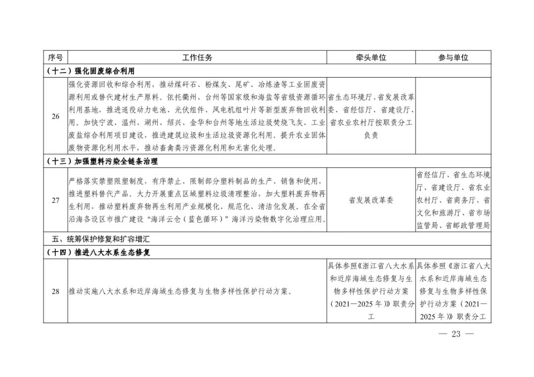 (十一)全域建設“無廢城市”。開展全國“無廢城市”數(shù)字 化改革試點建設。推進各類固體廢物源頭減量。加強生活垃圾 填埋場綜合治理。深入開展生活垃圾焚燒發(fā)電行業(yè)達標排放專 項整治。提升危險廢物監(jiān)管和利用處置能力,加快形成滿足實際需求的垃圾焚燒飛灰協(xié)同處理、廢鹽資源化利用能力。到 2025 年,全省城鄉(xiāng)生活垃圾分類實現(xiàn)全覆蓋,基本實現(xiàn)危險廢物“趨 零填埋”。