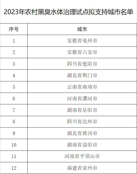 2023年5月19日,財(cái)政部官網(wǎng)公示2023年農(nóng)村黑臭水體治理試點(diǎn)支持城市名單,共12個(gè)城市,公示期從5月19日至5月26日。詳情如下:2023年農(nóng)村黑臭水體治理試點(diǎn)支持城市名單公示按照《財(cái)政部辦公廳 生態(tài)環(huán)境部辦公廳關(guān)于開展2023年農(nóng)村黑臭水體治理試點(diǎn)工作的通知》(財(cái)辦資環(huán)〔2023〕8號(hào))要求,財(cái)政部會(huì)同生態(tài)環(huán)境部組織專家對(duì)各地農(nóng)村黑臭水體治理申報(bào)城市實(shí)施方案進(jìn)行了競(jìng)爭(zhēng)性評(píng)審,并將12個(gè)城市確定為2023年支持的農(nóng)村黑臭水體治理試點(diǎn)城市(詳見附件)。現(xiàn)將結(jié)果予以公示,公示期從5月19日至5月26日。如有意見,請(qǐng)以書面(實(shí)名)形式反饋財(cái)政部自然資源和生態(tài)環(huán)境司、生態(tài)環(huán)境部土壤生態(tài)環(huán)境司。附件:2023年農(nóng)村黑臭水體治理試點(diǎn)擬支持城市名單聯(lián)系電話:010-61965527 010-65645718財(cái)政部自然資源和生態(tài)環(huán)境司 生態(tài)環(huán)境部土壤生態(tài)環(huán)境司2023年5月19日