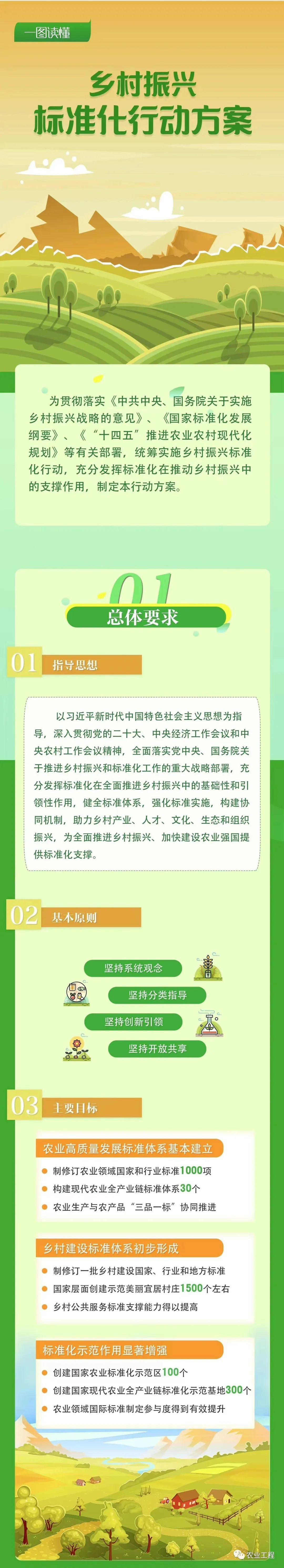 總的目標(biāo)就是,到2025年,農(nóng)業(yè)農(nóng)村高質(zhì)量發(fā)展標(biāo)準(zhǔn)體系基本建立,標(biāo)準(zhǔn)化推廣服務(wù)體系基本建成,農(nóng)業(yè)農(nóng)村標(biāo)準(zhǔn)的國(guó)際化程度顯著提高,標(biāo)準(zhǔn)化協(xié)調(diào)推進(jìn)機(jī)制基本形成。