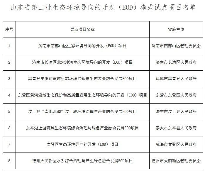 ?10月17日,山東省生態(tài)環(huán)境廳發(fā)布《關于同意開展第三批省級生態(tài)環(huán)境導向的開發(fā)(EOD)模式試點的通知》,經(jīng)研究,同意濟南市南部山區(qū)生態(tài)環(huán)境導向的開發(fā)(EOD)項目等8個項目(名單見附件)開展省級生態(tài)環(huán)境導向的開發(fā)(EOD)模式試點工作,期限為3年。關于同意開展第三批省級生態(tài)環(huán)境導向的開發(fā)(EOD)模式試點的通知魯環(huán)字〔2023〕130號濟南、淄博、東營、濟寧、泰安、威海、德州市生態(tài)環(huán)境局、發(fā)展改革委,人民銀行淄博、東營、濟寧、泰安、威海、德州市分行,各試點實施單位:為深入推進我省生態(tài)環(huán)境治理體系和治理能力現(xiàn)代化,提升生態(tài)環(huán)保產業(yè)發(fā)展水平,創(chuàng)新環(huán)境治理模式,根據(jù)《關于推薦第三批生態(tài)環(huán)境導向的開發(fā)(EOD)模式試點項目的通知》(魯環(huán)字〔2023〕70號)要求,經(jīng)研究,同意濟南市南部山區(qū)生態(tài)環(huán)境導向的開發(fā)(EOD)項目等8個項目(名單見附件)開展省級生態(tài)環(huán)境導向的開發(fā)(EOD)模式試點工作,期限為3年。現(xiàn)將有關事項通知如下。一、切實推進試點項目實施。各試點實施單位要嚴格貫徹落實國家和省有關生態(tài)環(huán)境治理模式創(chuàng)新和生態(tài)環(huán)保產業(yè)發(fā)展的要求,在試點工作開展過程中積極探索,創(chuàng)新生態(tài)環(huán)境治理項目組織實施方式,促進生態(tài)環(huán)境高水平保護和區(qū)域經(jīng)濟高質量發(fā)展。各市生態(tài)環(huán)境局、發(fā)展改革委要加強對試點工作督促指導,及時糾正試點工作中發(fā)現(xiàn)的問題,推進試點工作規(guī)范實施,國家開發(fā)銀行山東省分行將按照精準施策、市場化運作和風險可控的原則,在資源配置上予以傾斜,加大支持力度。二、依法依規(guī)開展試點工作。各試點實施單位是試點工作的責任主體,要嚴格按照有關要求開展試點工作,不得以試點名義突破現(xiàn)有法律法規(guī)政策等要求,不得以試點名義代替項目立項等程序,不得增加地方隱性債務。三、強化試點項目收益反哺機制。各試點實施單位要加強公益性生態(tài)環(huán)境治理項目與相關經(jīng)營性產業(yè)開發(fā)項目一體化融合實施。實施過程中可適當優(yōu)化試點依托項目,加大對生態(tài)環(huán)境治理的反哺力度。四、加強試點經(jīng)驗總結。各試點實施單位要加強統(tǒng)籌,及時總結經(jīng)驗做法,探索形成可復制、可推廣的生態(tài)環(huán)境治理創(chuàng)新模式。試點期內每年12月底前將年度進展情況報市生態(tài)環(huán)境局、發(fā)展改革委審查后,由兩部門上報省生態(tài)環(huán)境廳、發(fā)展改革委,同時抄報人民銀行山東省分行、國開行山東省分行。附件:山東省第三批生態(tài)環(huán)境導向的開發(fā)(EOD)模式試點項目名單