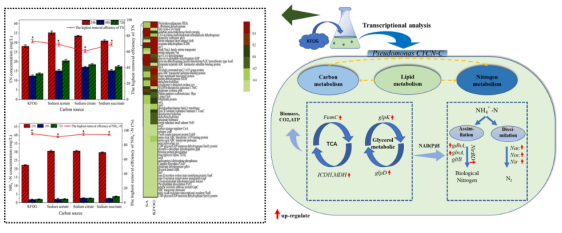 針對上述問題,研究團隊分離并鑒定了一株具有油脂利用和高效脫氮能力的假單胞菌CYCN-C。菌株CYCN-C以KFOG為唯一碳源,TN的去除率可以達到73.5%。并且利用轉錄組技術分析了菌株CYCN-C分別以KFOG和乙酸鈉為碳源時的基因表達情況。結果顯示,KFOG組中部分基因表達水平顯著升高,其中包括參與碳代謝的細胞色素o泛醇氧化酶(cyo)、碳儲存調(diào)節(jié)蛋白基因(CsrA)、聚羥基烷酸酯(PHAs)和延胡索酸酶(FumC)基因分別上調(diào)6.9倍、0.7倍、26.0倍和19.0倍,參與氮代謝的硝酸還原酶(nar)和亞硝酸鹽還原酶(nirB、nirD)基因分別上調(diào)115倍、30倍和49倍,參與脂質(zhì)代謝途徑的脂肪酶(lipA、lipB)、甘油-3-磷酸脫氫酶(glpD)和甘油激酶(glpK)基因分別上調(diào)0.6倍、0.4倍、21.5倍和1.3倍。本研究驗證了廢棄油脂作為碳源的可行性,并為該細菌利用廢棄油脂和脫氮的代謝機制提供了新的見解。