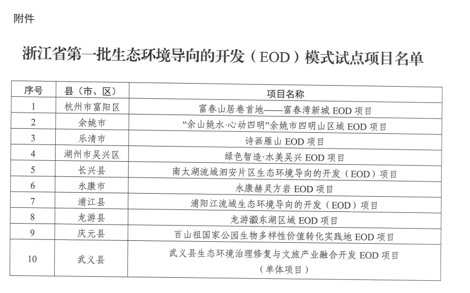 杭州市、寧波市、溫州市、湖州市、金華市、衢州市、麗水市 生態(tài)環(huán)境局、發(fā)展改革委,國家開發(fā)銀行浙江省分行、農(nóng)業(yè)發(fā)展銀行浙江省分行相關(guān)部門及分支機(jī)構(gòu),各試點(diǎn)實施單位: 為深入貫徹落實黨中央、國務(wù)院關(guān)于全面加強(qiáng)生態(tài)環(huán)境保護(hù)、深入打好污染防治攻堅戰(zhàn)的決策部署,持續(xù)推進(jìn)環(huán)境治理模式創(chuàng)新,深入探索浙江省生態(tài)環(huán)境導(dǎo)向的開發(fā) (EOD) 模式實踐,打造綠色共富高地、助力推進(jìn)“兩個先行”,根據(jù)《關(guān)于組織開展省級生態(tài)環(huán)境導(dǎo)向的開發(fā) (EOD) 模式試點(diǎn)工作的通知》(浙環(huán)函〔2023〕99 號)要求,對杭州市生態(tài)環(huán)境局等推薦的 EOD模式試點(diǎn)項目(以下簡稱試點(diǎn)項目)進(jìn)行了審核?,F(xiàn)將有關(guān)事項通知如下。 一、同意杭州市富陽區(qū)等10個項目(名單見附件)開展生態(tài)環(huán)境導(dǎo)向的開發(fā) (EOD) 模式試點(diǎn)工作,國家開發(fā)銀行浙江 省分行、農(nóng)業(yè)發(fā)展銀行浙江省分行相關(guān)部門及分支機(jī)構(gòu)將按照 精準(zhǔn)施策、市場化運(yùn)作和風(fēng)險可控原則,發(fā)揮開發(fā)性金融大額中長期資金優(yōu)勢,統(tǒng)籌考慮經(jīng)濟(jì)效益和環(huán)境效益,在資源配置上予以傾斜,在貸款利率、周期等方面給予優(yōu)惠支持。 二、認(rèn)真貫徹國家有關(guān)生態(tài)環(huán)境治理模式創(chuàng)新和環(huán)保產(chǎn)業(yè)發(fā)展要求。在試點(diǎn)工作開展過程中積極探索,創(chuàng)新生態(tài)環(huán)境治理項目組織實施方式,促進(jìn)生態(tài)環(huán)境高水平保護(hù)和區(qū)域經(jīng)濟(jì)高質(zhì)量發(fā)展。市級生態(tài)環(huán)境、發(fā)展改革部門等試點(diǎn)推進(jìn)單位加強(qiáng)對試點(diǎn)工作的督促指導(dǎo),對試點(diǎn)工作中發(fā)現(xiàn)的問題要及時予以糾正,推進(jìn)試點(diǎn)工作規(guī)范實施。 三、 依法依規(guī)開展試點(diǎn)工作。試點(diǎn)實施單位是試點(diǎn)工作的責(zé)任主體,要嚴(yán)格履行試點(diǎn)實施承諾,不以試點(diǎn)名義突破現(xiàn)有 法律法規(guī)政策等要求,嚴(yán)格落實招投標(biāo)、政府采購、投融資、 土地、資源開發(fā)、空間管控、資產(chǎn)處置等各項法規(guī)政策,不以任何形式增加地方政府隱性債務(wù)。采用合法合規(guī)方式選擇具備較強(qiáng)產(chǎn)業(yè)投資運(yùn)營能力的項目實施主體,由一個主體一體化實施,確保產(chǎn)業(yè)開發(fā)項目持續(xù)運(yùn)營。 四 、強(qiáng)化項目收益內(nèi)部反哺機(jī)制。試點(diǎn)實施單位切實加強(qiáng)公益性生態(tài)環(huán)境治理項目與相關(guān)經(jīng)營性產(chǎn)業(yè)開發(fā)項目一體化融 合實施。在項目邊界范圍內(nèi)實現(xiàn)產(chǎn)業(yè)開發(fā)項目對生態(tài)環(huán)境治理項目建設(shè)與運(yùn)營的持續(xù)性收益反哺。實施中可適當(dāng)優(yōu)化試點(diǎn)依托項目,加強(qiáng)產(chǎn)業(yè)收益對生態(tài)環(huán)境治理的反哺力度,減少政府資金投入。 五、加快推進(jìn)試點(diǎn)工作。試點(diǎn)實施單位加強(qiáng)統(tǒng)籌,及時總結(jié)經(jīng)驗做法,探索形成可復(fù)制、可推廣的生態(tài)環(huán)境治理創(chuàng)新模式。試點(diǎn)實施單位于每季度首月10日前將試點(diǎn)項目季度實施進(jìn)度情況報送省生態(tài)環(huán)境廳。附件:浙江省第一批生態(tài)環(huán)境導(dǎo)向的開發(fā) (EOD) 模式試點(diǎn)項目名單