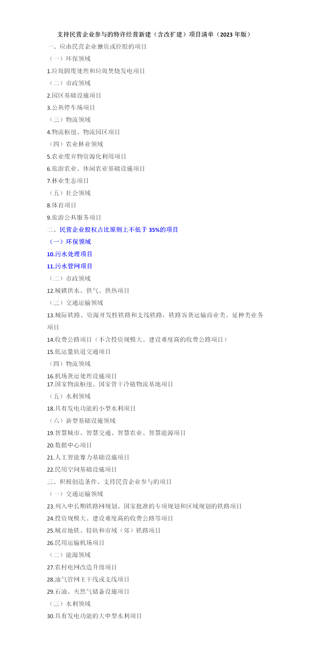 ?日前,國務(wù)院辦公廳發(fā)布《關(guān)于規(guī)范實施政府和社會資本合作新機制的指導(dǎo)意見》,《意見》就規(guī)范實施政府和社會資本合作新機制(簡稱新機制)提出指導(dǎo)意見。包括:(一)聚焦使用者付費項目。政府和社會資本合作項目應(yīng)聚焦使用者付費項目,明確收費渠道和方式,項目經(jīng)營收入能夠覆蓋建設(shè)投資和運營成本、具備一定投資回報,不因采用政府和社會資本合作模式額外新增地方財政未來支出責(zé)任。政府可在嚴(yán)防新增地方政府隱性債務(wù)、符合法律法規(guī)和有關(guān)政策規(guī)定要求的前提下,按照一視同仁的原則,在項目建設(shè)期對使用者付費項目給予政府投資支持;政府付費只能按規(guī)定補貼運營、不能補貼建設(shè)成本。除此之外,不得通過可行性缺口補助、承諾保底收益率、可用性付費等任何方式,使用財政資金彌補項目建設(shè)和運營成本。 (二)全部采取特許經(jīng)營模式。政府和社會資本合作應(yīng)全部采取特許經(jīng)營模式實施,根據(jù)項目實際情況,合理采用建設(shè)—運營—移交(BOT)、轉(zhuǎn)讓—運營—移交(TOT)、改建—運營—移交(ROT)、建設(shè)—擁有—運營—移交(BOOT)、設(shè)計—建設(shè)—融資—運營—移交(DBFOT)等具體實施方式,并在合同中明確約定建設(shè)和運營期間的資產(chǎn)權(quán)屬,清晰界定各方權(quán)責(zé)利關(guān)系。 (三)合理把握重點領(lǐng)域。政府和社會資本合作應(yīng)限定于有經(jīng)營性收益的項目,主要包括公路、鐵路、民航基礎(chǔ)設(shè)施和交通樞紐等交通項目,物流樞紐、物流園區(qū)項目,城鎮(zhèn)供水、供氣、供熱、停車場等市政項目,城鎮(zhèn)污水垃圾收集處理及資源化利用等生態(tài)保護和環(huán)境治理項目,具有發(fā)電功能的水利項目,體育、旅游公共服務(wù)等社會項目,智慧城市、智慧交通、智慧農(nóng)業(yè)等新型基礎(chǔ)設(shè)施項目,城市更新、綜合交通樞紐改造等盤活存量和改擴建有機結(jié)合的項目。 (四)優(yōu)先選擇民營企業(yè)參與。要堅持初衷、回歸本源,最大程度鼓勵民營企業(yè)參與政府和社會資本合作新建(含改擴建)項目,制定《支持民營企業(yè)參與的特許經(jīng)營新建(含改擴建)項目清單(2023年版)》(以下簡稱清單,見附件)并動態(tài)調(diào)整。關(guān)于規(guī)范實施政府和社會資本合作新機制的指導(dǎo)意見國家發(fā)展改革委 財政部政府和社會資本合作(PPP)實施近十年來,一定程度上起到了改善公共服務(wù)、拉動有效投資的作用,但在實踐中也出現(xiàn)了一些亟待解決的問題。為貫徹落實黨中央、國務(wù)院決策部署,進一步深化基礎(chǔ)設(shè)施投融資體制改革,切實激發(fā)民間投資活力,現(xiàn)就規(guī)范實施政府和社會資本合作新機制(簡稱新機制)提出如下指導(dǎo)意見。一、準(zhǔn)確把握新機制的總體要求以習(xí)近平新時代中國特色社會主義思想為指導(dǎo),深入貫徹黨的二十大精神,堅持穩(wěn)中求進工作總基調(diào),完整、準(zhǔn)確、全面貫徹新發(fā)展理念,加快構(gòu)建新發(fā)展格局,著力推動高質(zhì)量發(fā)展,統(tǒng)籌發(fā)展和安全,規(guī)范實施政府和社會資本合作新機制,充分發(fā)揮市場機制作用,拓寬民間投資空間,堅決遏制新增地方政府隱性債務(wù),提高基礎(chǔ)設(shè)施和公用事業(yè)項目建設(shè)運營水平,確保規(guī)范發(fā)展、陽光運行。(一)聚焦使用者付費項目。政府和社會資本合作項目應(yīng)聚焦使用者付費項目,明確收費渠道和方式,項目經(jīng)營收入能夠覆蓋建設(shè)投資和運營成本、具備一定投資回報,不因采用政府和社會資本合作模式額外新增地方財政未來支出責(zé)任。政府可在嚴(yán)防新增地方政府隱性債務(wù)、符合法律法規(guī)和有關(guān)政策規(guī)定要求的前提下,按照一視同仁的原則,在項目建設(shè)期對使用者付費項目給予政府投資支持;政府付費只能按規(guī)定補貼運營、不能補貼建設(shè)成本。除此之外,不得通過可行性缺口補助、承諾保底收益率、可用性付費等任何方式,使用財政資金彌補項目建設(shè)和運營成本。(二)全部采取特許經(jīng)營模式。政府和社會資本合作應(yīng)全部采取特許經(jīng)營模式實施,根據(jù)項目實際情況,合理采用建設(shè)—運營—移交(BOT)、轉(zhuǎn)讓—運營—移交(TOT)、改建—運營—移交(ROT)、建設(shè)—擁有—運營—移交(BOOT)、設(shè)計—建設(shè)—融資—運營—移交(DBFOT)等具體實施方式,并在合同中明確約定建設(shè)和運營期間的資產(chǎn)權(quán)屬,清晰界定各方權(quán)責(zé)利關(guān)系。(三)合理把握重點領(lǐng)域。政府和社會資本合作應(yīng)限定于有經(jīng)營性收益的項目,主要包括公路、鐵路、民航基礎(chǔ)設(shè)施和交通樞紐等交通項目,物流樞紐、物流園區(qū)項目,城鎮(zhèn)供水、供氣、供熱、停車場等市政項目,城鎮(zhèn)污水垃圾收集處理及資源化利用等生態(tài)保護和環(huán)境治理項目,具有發(fā)電功能的水利項目,體育、旅游公共服務(wù)等社會項目,智慧城市、智慧交通、智慧農(nóng)業(yè)等新型基礎(chǔ)設(shè)施項目,城市更新、綜合交通樞紐改造等盤活存量和改擴建有機結(jié)合的項目。(四)優(yōu)先選擇民營企