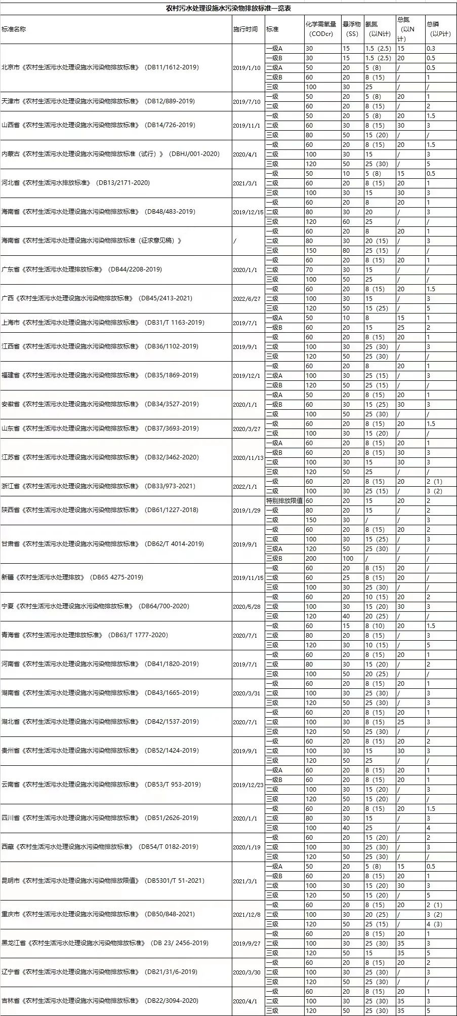 一、全國31省農(nóng)村污水排放標(biāo)準(zhǔn)