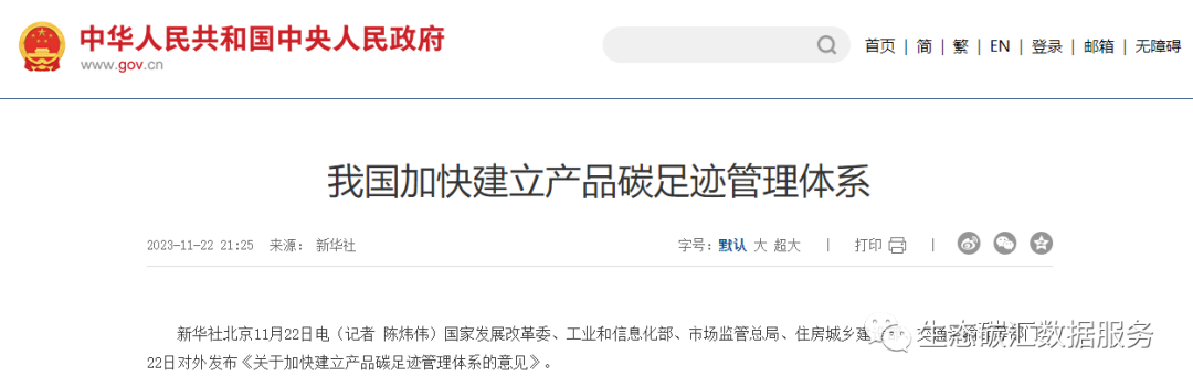 2023年11月22日,國家發(fā)展改革委、工業(yè)和信息化部、市場監(jiān)管總局、住房城鄉(xiāng)建設(shè)部、交通運(yùn)輸部等部門對外發(fā)布了《關(guān)于加快建立產(chǎn)品碳足跡管理體系的意見》(以下簡稱《意見》),《意見》對產(chǎn)品碳足跡管理各項(xiàng)重點(diǎn)任務(wù)作出系統(tǒng)部署,提出制定產(chǎn)品碳足跡核算規(guī)則標(biāo)準(zhǔn)、加強(qiáng)碳足跡背景數(shù)據(jù)庫建設(shè)、建立產(chǎn)品碳標(biāo)識認(rèn)證制度、豐富產(chǎn)品碳足跡應(yīng)用場景、推動碳足跡國際銜接與互認(rèn)等工作舉措,并明確了職責(zé)分工和保障措施等。