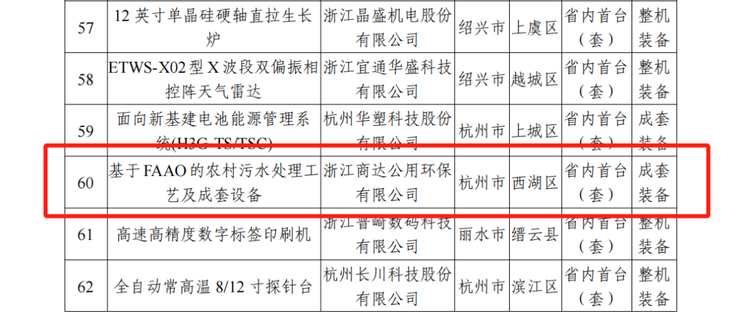 2023年12月31日,浙江省經(jīng)濟(jì)和信息化廳公布《2023年度浙江省首臺(tái)(套)裝備名單》,確定2023年度浙江省首臺(tái)(套)裝備292項(xiàng),其中國(guó)際首臺(tái)(套)裝備3項(xiàng)、國(guó)內(nèi)首臺(tái)(套)裝備53項(xiàng)、省內(nèi)首臺(tái)(套)裝備236項(xiàng)。商達(dá)公用“基于FAAO的農(nóng)村污水處理工藝成套設(shè)備”成功認(rèn)定浙江省首臺(tái)(套)裝備。