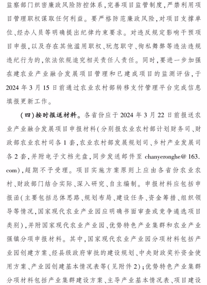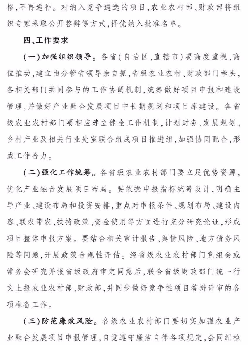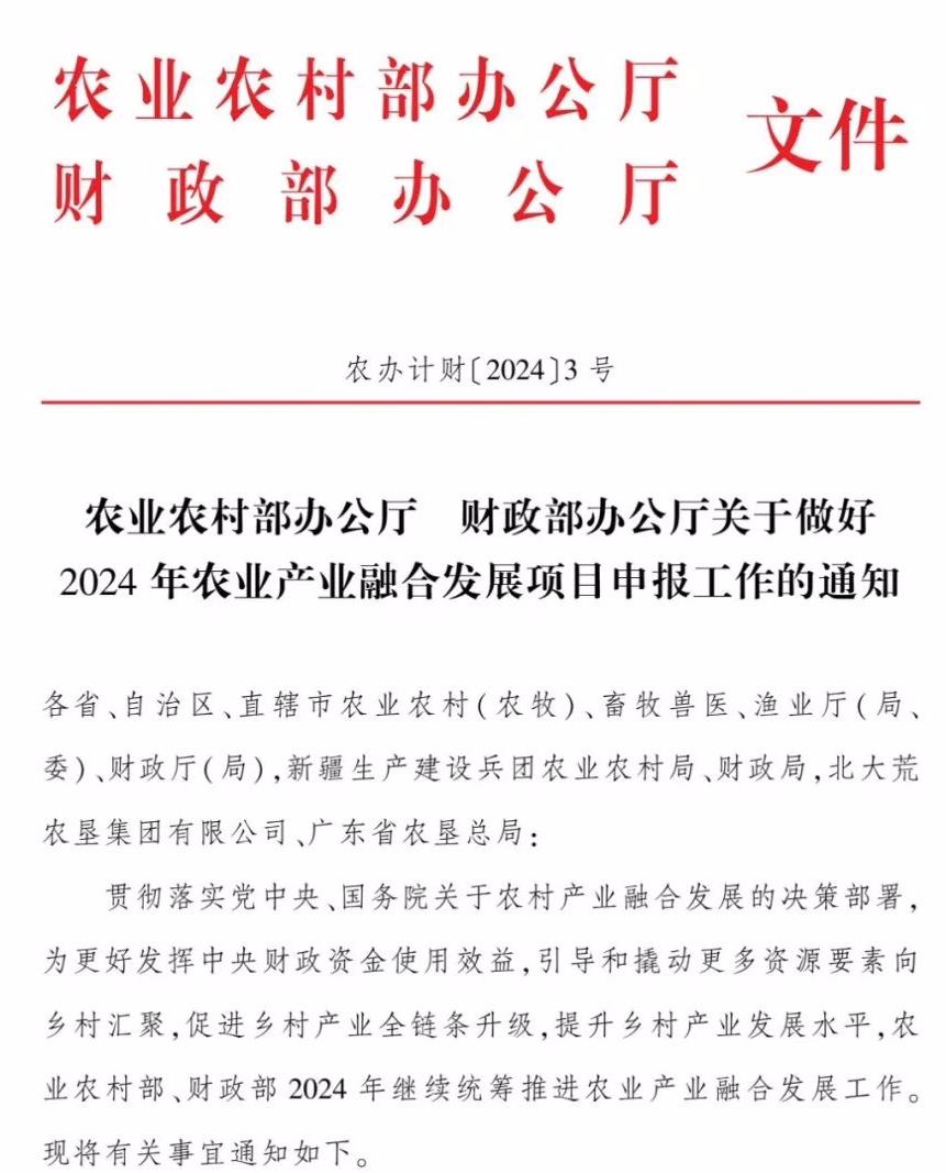 為更好發(fā)揮中央財政資金使用效益,引導和撬動更多資源要素向鄉(xiāng)村匯聚,促進鄉(xiāng)村產(chǎn)業(yè)全鏈條升級,提升鄉(xiāng)村產(chǎn)業(yè)發(fā)展水平,農(nóng)業(yè)農(nóng)村部、財政部2024年繼續(xù)統(tǒng)籌推進農(nóng)業(yè)產(chǎn)業(yè)融合發(fā)展工作,具體申報通知如下: