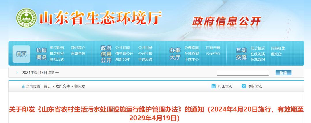關(guān)于印發(fā)《山東省農(nóng)村生活污水處理設(shè)施運(yùn)行維護(hù)管理辦法》的通知(2024年4月20日施行,有效期至2029年4月19日)