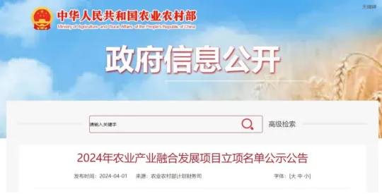 (文末附農(nóng)業(yè)產(chǎn)業(yè)融合發(fā)展項目立項名單) 按照《農(nóng)業(yè)農(nóng)村部辦公廳 財政部辦公廳關(guān)于做好2024年農(nóng)業(yè)產(chǎn)業(yè)融合發(fā)展項目申報工作的通知》(農(nóng)辦計財〔2024〕3號)要求,已按程序完成2024年農(nóng)業(yè)產(chǎn)業(yè)融合發(fā)展項目立項評審工作,現(xiàn)將擬批準(zhǔn)立項名單進行公示,公示期為4月1—3日。如有異議,請實名(單位主要負責(zé)人簽字并加蓋公章)向農(nóng)業(yè)農(nóng)村部計劃財務(wù)司反映。反映情況要實事求是,并提供證明材料。 聯(lián)系電話:18911722771