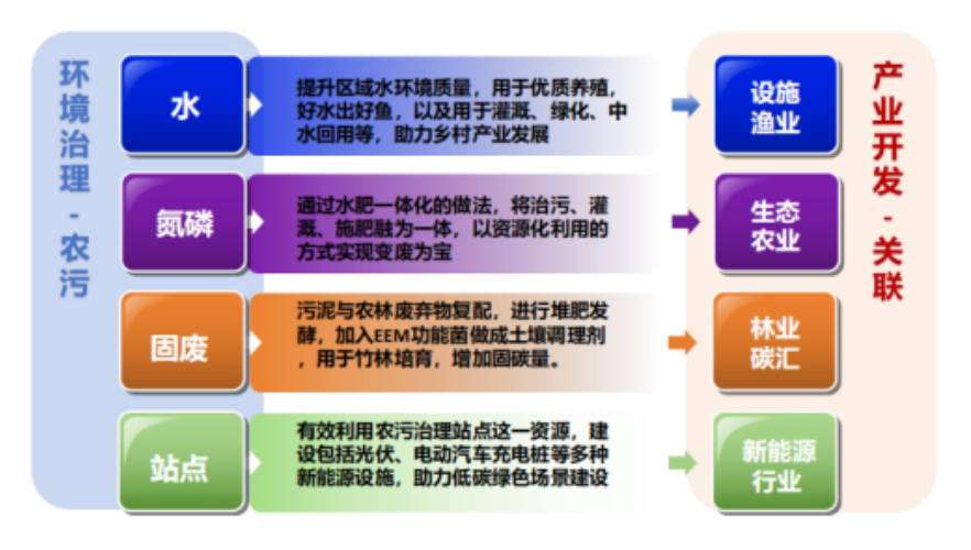 該理念是基于綠色鄉(xiāng)村 EOD 價值體系,通過機制、技術創(chuàng)新,將農(nóng)污治理與鄉(xiāng)村振興相關綠色農(nóng)業(yè)、設施漁業(yè)、碳中和、新能源等產(chǎn)業(yè)相融合,建立“生態(tài)、生產(chǎn)、生活”三生共融的生態(tài)治理模式并融合以“需求拉動、供給推動、貿(mào)易聯(lián)動”為核心驅動的高效生態(tài)產(chǎn)業(yè)發(fā)展,堅持生態(tài)優(yōu)先、綠色發(fā)展,通過治理農(nóng)村生活污水,營造清澈鄉(xiāng)村視界實現(xiàn)“水清岸綠、魚翔淺底”,變“生態(tài)包袱”為“綠色財富”