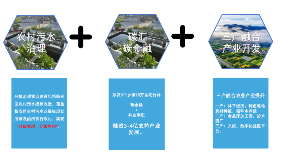 項目以生態(tài)環(huán)境為導向帶動產(chǎn)業(yè)發(fā)展的理念,以“三產(chǎn)相融”農(nóng)村產(chǎn)業(yè)高質量發(fā)展為載體,通過“分級處理、分級利用”實現(xiàn)污水資源化利用,促進林業(yè)碳匯、生態(tài)農(nóng)業(yè)和農(nóng)旅康養(yǎng)等鄉(xiāng)村產(chǎn)業(yè)發(fā)展,助力臨安區(qū)打造高標準鄉(xiāng)村振興實踐案例,高質量共同富裕示范樣板。