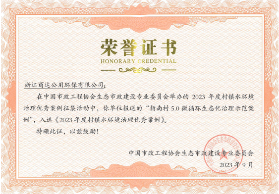 《全國村鎮(zhèn)污水治理優(yōu)秀案例》榮譽證書