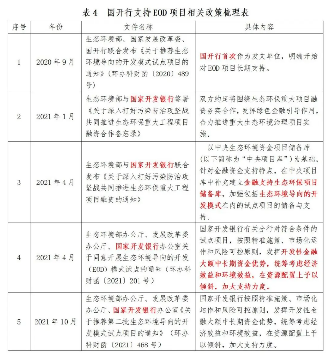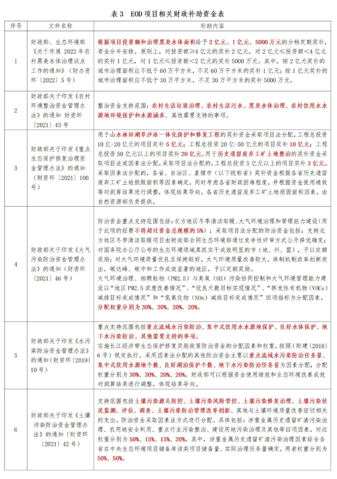 通過梳理我國近年來的政策文件,結(jié)合EOD項目申報范圍,補(bǔ)助資金的具體內(nèi)容如下表:EOD項目融資資金可通過:政策性銀行融資、商業(yè)銀行融資、政府債券、綠色基金等方式籌集項目資金。其中以政策性銀行融資為主要方式。政策性銀行關(guān)于支持我國EOD項目的相關(guān)政策內(nèi)容整理如下:自2020年與生態(tài)環(huán)境部、國家發(fā)展改革委聯(lián)合推動開展生態(tài)環(huán)境導(dǎo)向的開發(fā)模式(EOD)試點(diǎn)工作以來,截至2022年底,國家開發(fā)銀行已向25個試點(diǎn)項目發(fā)放貸款225億元,涉及水生態(tài)環(huán)境保護(hù)、廢舊資源再生利用、農(nóng)業(yè)農(nóng)村污染治理、生態(tài)保護(hù)修復(fù)等多個領(lǐng)域。EOD模式是加強(qiáng)生態(tài)環(huán)保投融資、推進(jìn)生態(tài)產(chǎn)業(yè)價值實(shí)現(xiàn)的重要探索。據(jù)統(tǒng)計,國家開發(fā)銀行支持生態(tài)環(huán)境部EOD試點(diǎn)項目的個數(shù)、金額均居同業(yè)首位。