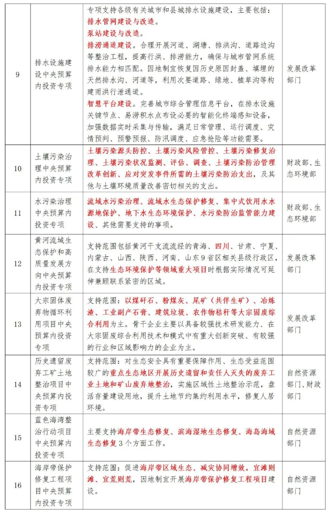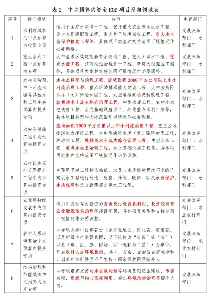根據(jù)《政府投資條例》,中央預(yù)算內(nèi)投資資金的安排方式包括直接投資、資本金注入、投資補(bǔ)助、貸款貼息等。2020-2022年,中央預(yù)算總盤子投資計劃分別為6000億、6100億、6400億。2023年,中央預(yù)算內(nèi)資金支持的投向領(lǐng)域有37個,與EOD項目建設(shè)內(nèi)容相契合的有16個,具體見下表: