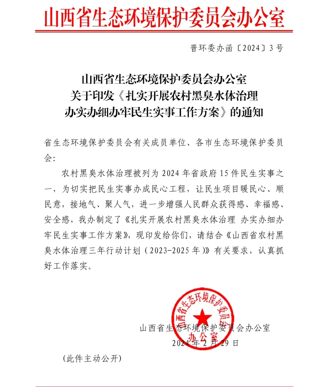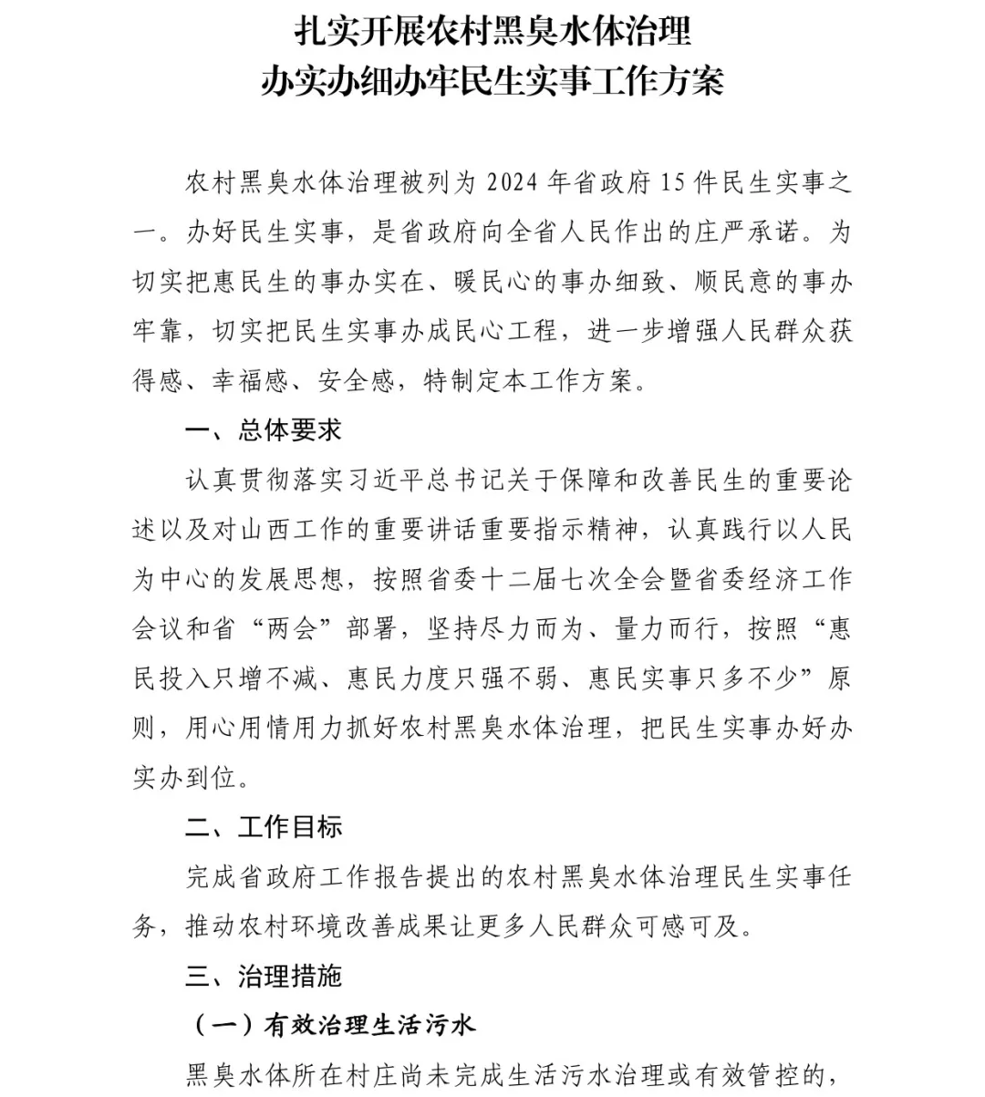 《山西開展農(nóng)村黑臭水體治理辦實(shí)辦細(xì)辦牢民生實(shí)事工作方案》!